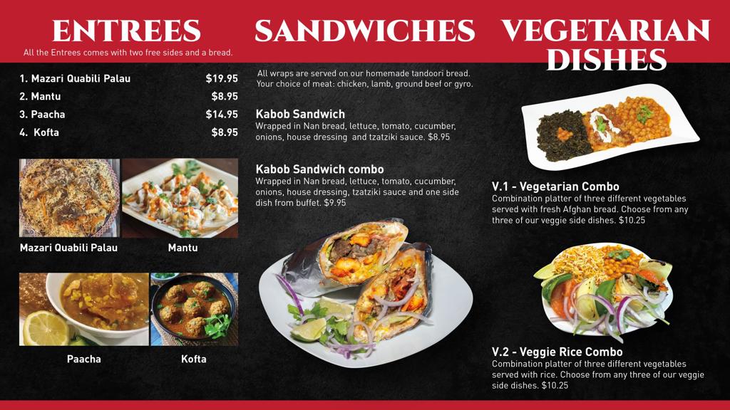 “ Delicious satisfying Afghan meals. The national dish, Kabuli Pulao (Lamb over aromatic rice), was the best. The large breads were amazing. Very friendly service. ”